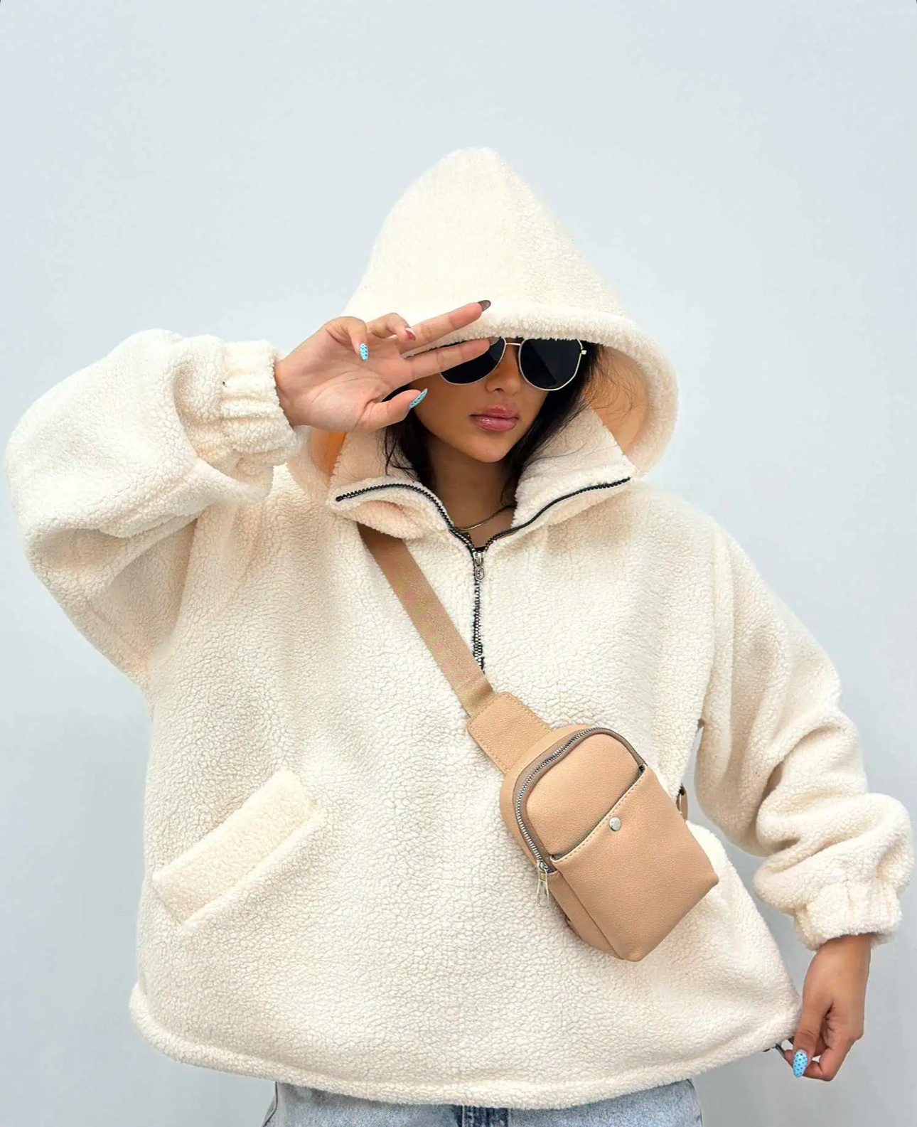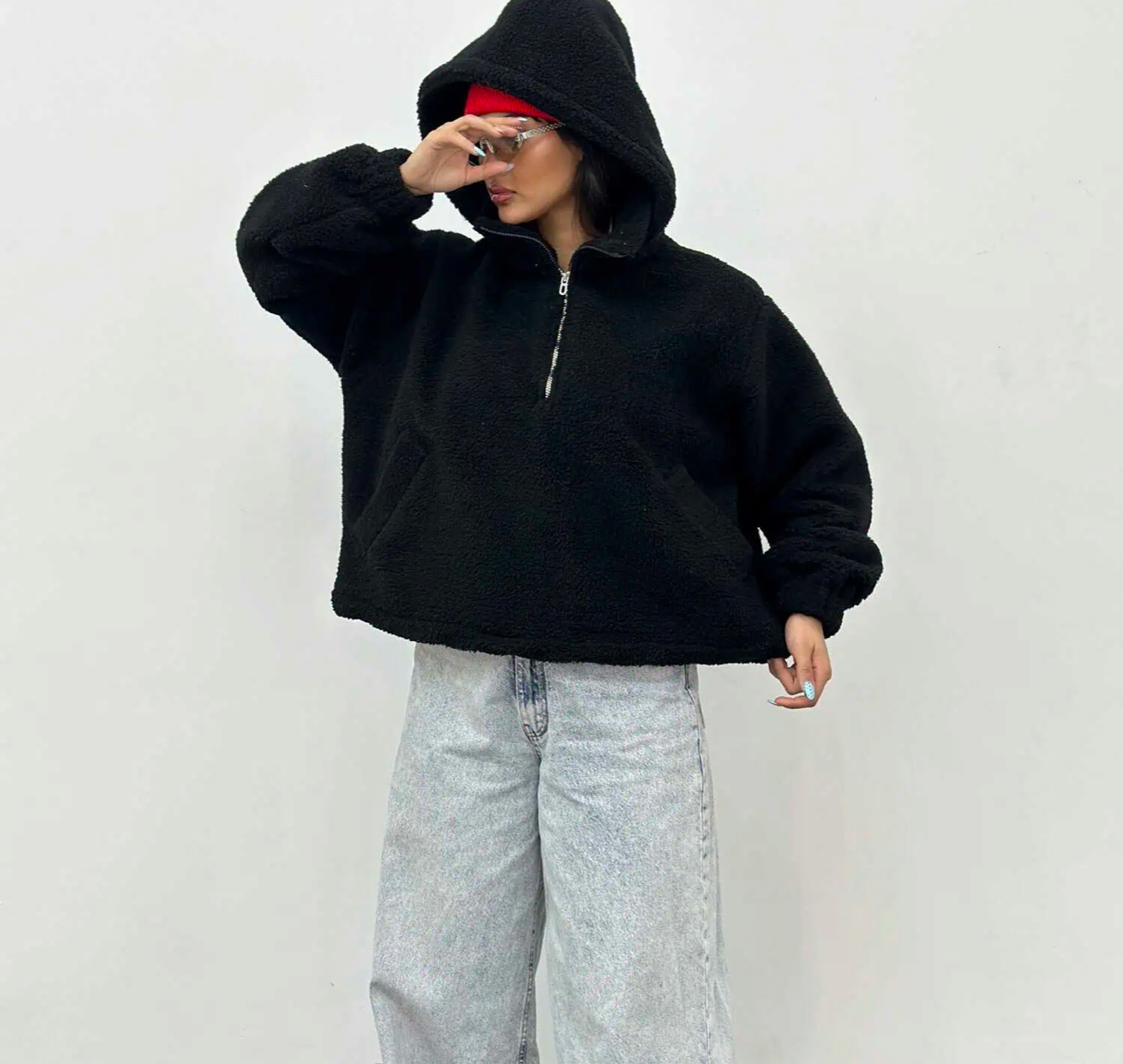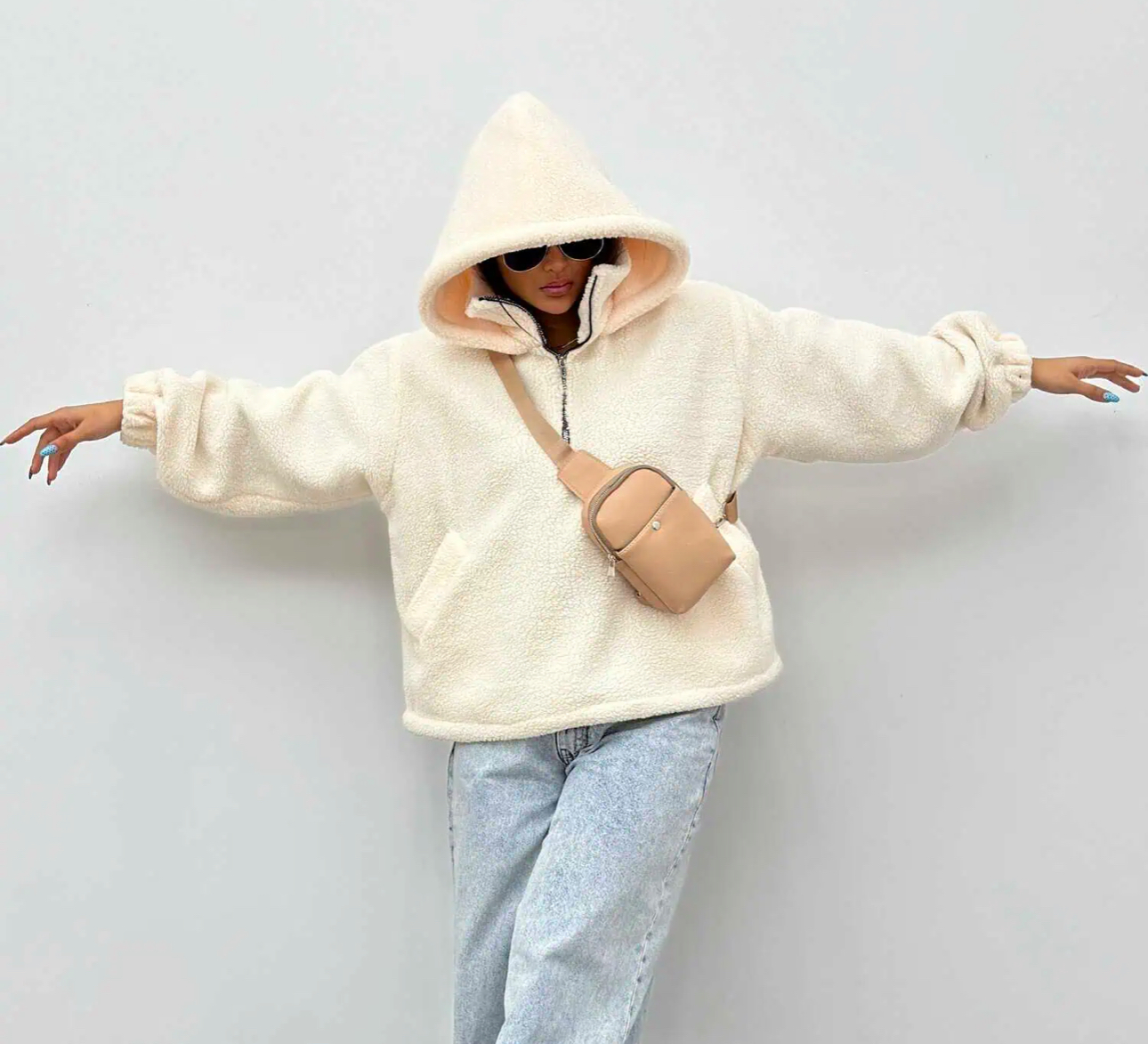 نیمزیپ هودی خز دار تدی وارداتی کیتی پوست| زنانه | استرکشی شده | هودی لطیف نرم و گرم پینترستی اعلا درجه یک – فریسایز ۳۶ تا ۴۶